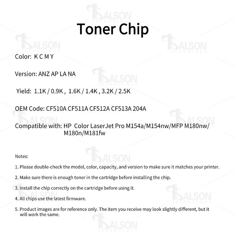 Designed for long-lasting durability and efficient operation, the printer chip supports frequent printing tasks without compromising color quality or toner accuracy. To achieve the best performance, ensure that the toner chip is correctly matched to the CF510A / 204A toner cartridge and installed securely.