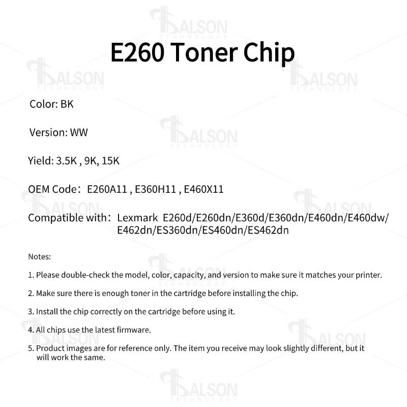 For users seeking a durable, accurate, and cost-efficient solution, the Lexmark E260 toner chip is an excellent choice to ensure smooth operation, consistent results, and efficient toner management across Lexmark E260, E360, and E460 printer series.