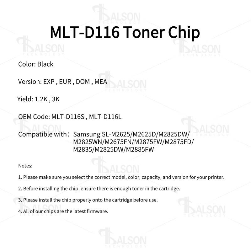 To ensure worldwide compatibility, the MLT-D116 toner chip is available in multiple regional versions, including EXP, EUR, DOM, and MEA. Each regional version is programmed to match the firmware requirements of Samsung printers sold in different markets. Selecting the correct region when purchasing the MLT-D116 toner chip is essential to guarantee proper cartridge recognition, accurate page counting, and smooth printer operation.