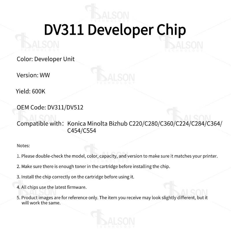 The DV311/DV512 developer unit chip is ideal for enterprises, copy centers, and managed print service providers that rely on Konica Minolta Bizhub color printers for continuous document production. Accurate developer tracking helps users plan maintenance schedules efficiently while preserving image density, color balance, and overall print quality.