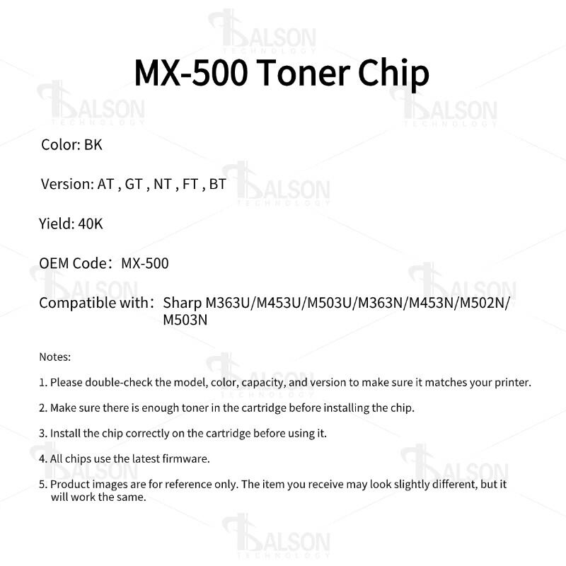 The compatible toner chip combines high yield, regional compatibility, and stable performance into a professional-grade printing solution. It is an ideal choice for businesses seeking reliable monochrome output, lower operating costs, and minimal maintenance issues. For users who demand consistency and efficiency, the MX-500 toner chip delivers dependable performance for SHARP M363 monochrome multifunction printers.