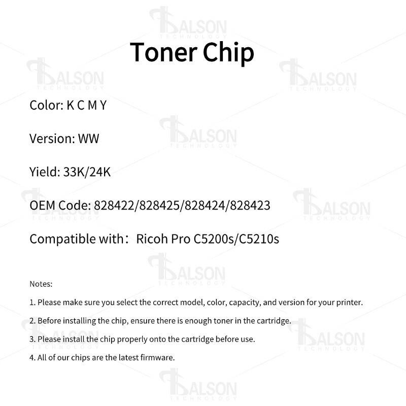 The compatible toner chip combines high yield, stable performance, and broad compatibility to meet the demands of professional color printing. With reliable toner monitoring, smooth operation, and global usability, this Ricoh Pro C5200 toner chip is a dependable and economical solution for businesses seeking consistent, high-quality output and optimized printing efficiency.
