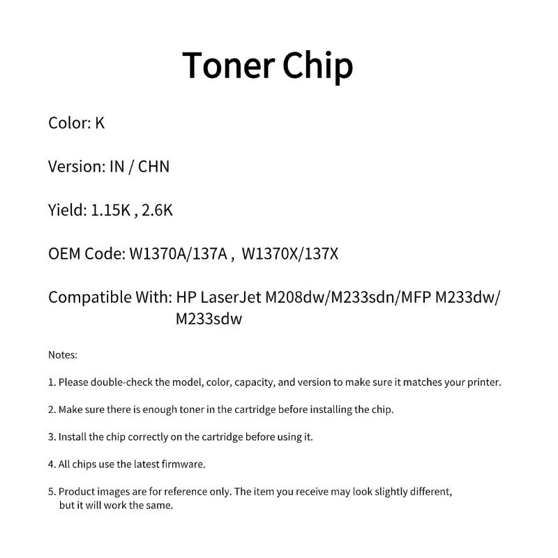 The compatible toner chip is an ideal replacement for users who seek a high-quality and budget-friendly alternative to the HP W1370 OEM toner chip. With its strong compatibility and cost-effective pricing, this chip ensures that you can keep your HP LaserJet M208dw/M233sdn/MFP M233dw/M233sdw printers running at peak efficiency without compromising on print quality or performance.
