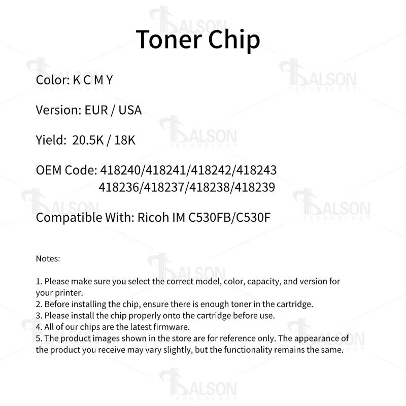 The IM C530F toner chip is a compatible chip designed for Ricoh IM C530FB and IM C530F color laser printers. As a key electronic component in the toner cartridge, the IM C530F printer chip ensures accurate communication between the printer and the cartridge, allowing the printer to correctly recognize the cartridge and monitor toner levels. With stable performance and reliable page counting, the toner cartridge chip helps maintain smooth printing operations and consistent color output.